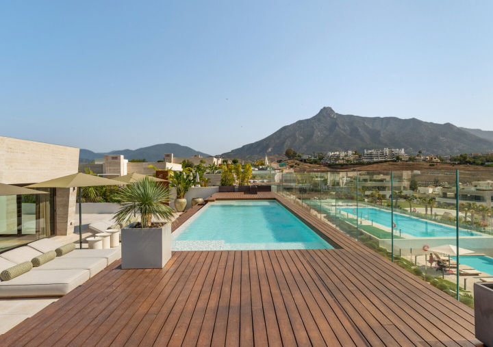 High-quality carpentry and sweeping panoramic views from the main floor terraces and solarium further elevate the living experience. On the upper level, a private swimming pool offers a serene personal retreat, complemented by the option to install a bar or barbecue area—perfect for leisure and entertaining.