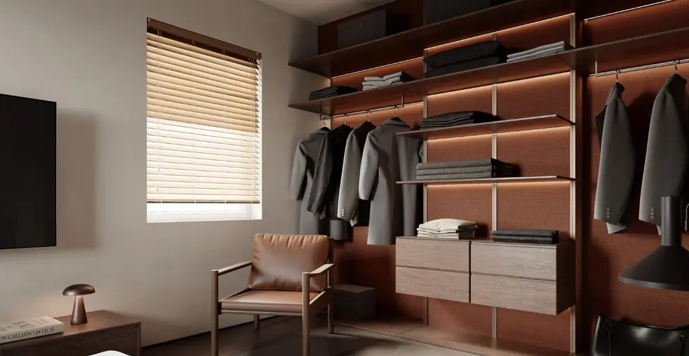 The design harmoniously blends mid-century elegance with modern sophistication, creating a contemporary yet inviting atmosphere. The carefully curated selection of materials includes the rich allure of dark oak wood, the timeless appeal of parquet flooring, and the refined texture of small-format tiles, complemented by subtle olive and royal green accents.